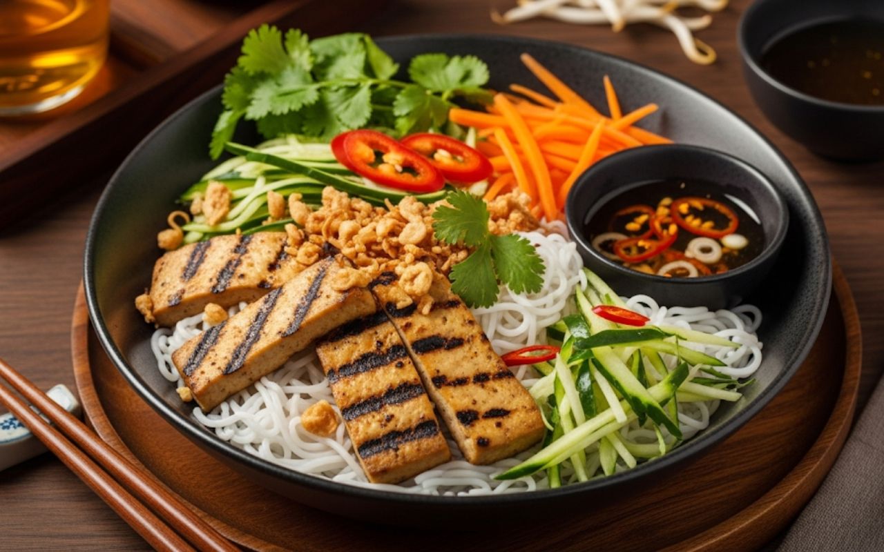 Bún thịt nướng chay là phiên bản thuần chay của món bún thịt nướng truyền thống, với sự kết hợp tuyệt vời của các nguyên liệu như đậu hũ nướng, nấm và rau sống, mang đến hương vị thơm ngon, thanh đạm mà không kém phần hấp dẫn. Món ăn này dễ làm, không chỉ ngon mà còn rất bổ dưỡng, thích hợp cho những ai yêu thích chế độ ăn chay hoặc muốn thưởng thức món ăn nhẹ nhàng, giàu dinh dưỡng.