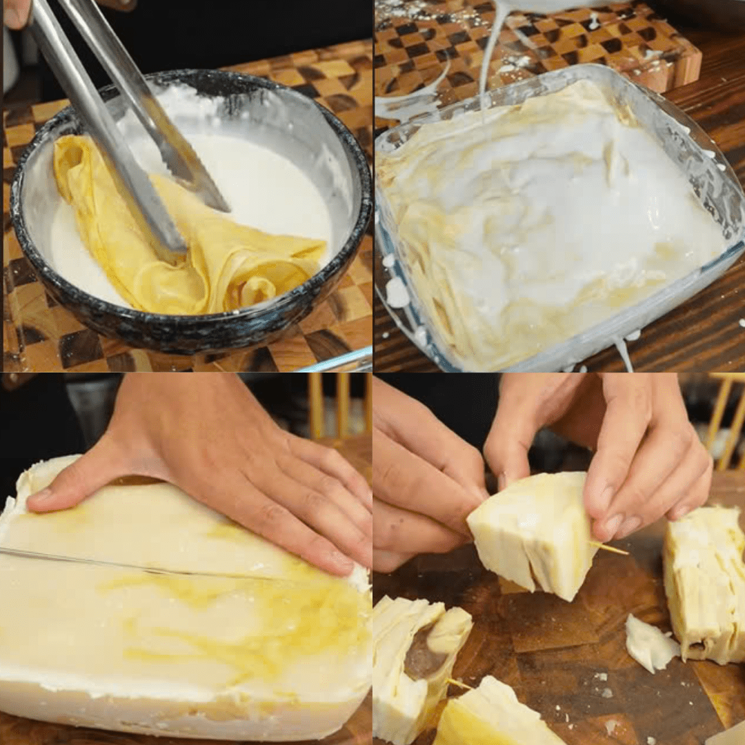 Tàu hũ ky khô: Ngâm nước trong 2 phút, vớt ra và vắt ráo.