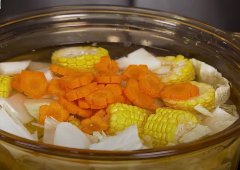 Đầu tiên, bạn đun sôi khoảng 1,5 lít nước lọc. Cho vào nồi bắp, cà rốt, củ cải trắng, su hào và bắp cải để tạo vị ngọt thanh tự nhiên.