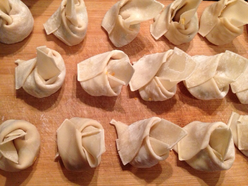 - Tiến hành gói hoành thánh với nhân vừa làm.