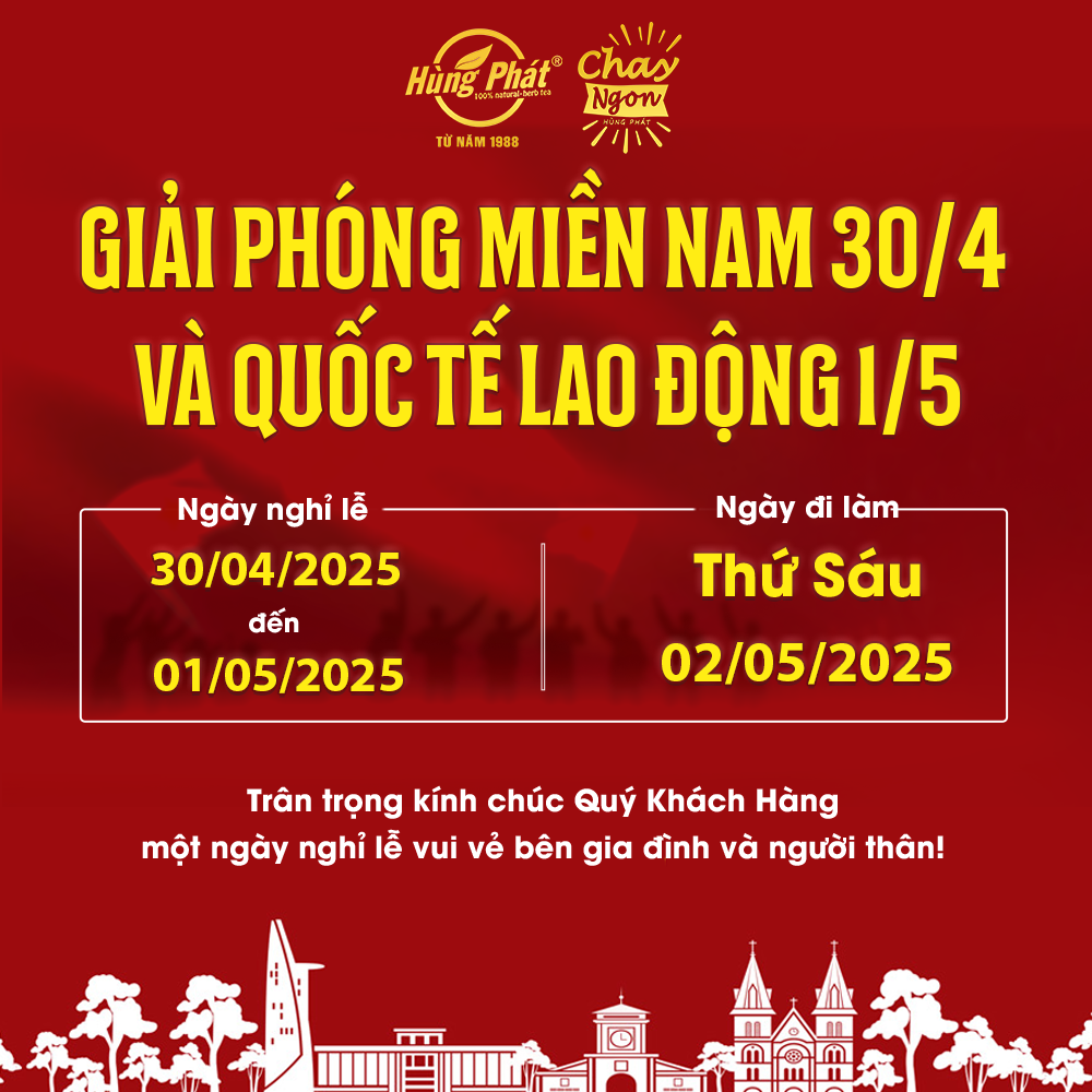 Nhân dịp kỷ niệm 50 năm Ngày Giải phóng miền Nam 30/4 và Ngày Quốc tế Lao động 1/5, Chay Ngon Hùng Phát xin gửi lời chúc tốt đẹp nhất đến Quý khách hàng và Quý đối tác.