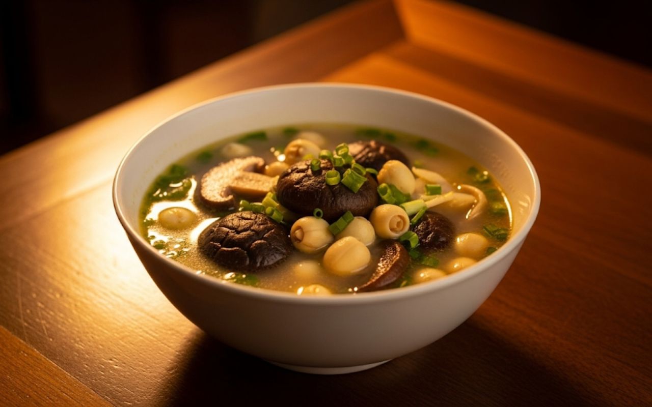 Thành phẩm: Nước canh trong và có vị ngọt thanh tự nhiên. Hạt sen bùi bở, nấm giòn ngọt, màu sắc hài hòa.