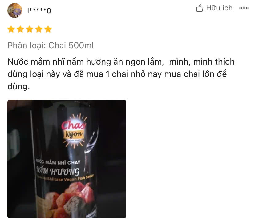 - Khánh hàng ẩn tên: “Nước mắm nhĩ nấm hương ăn ngon lắm, mình thích dùng loại này và đã mua 1 chai nhỏ nay mua chai lớn để dùng”