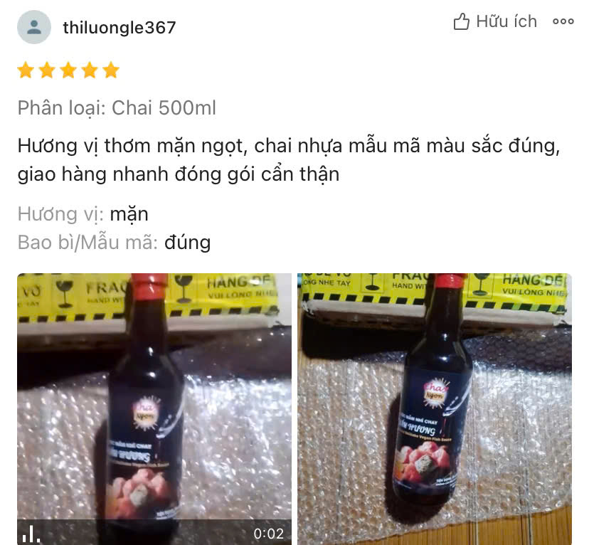 - Chị thiluongle 367 "Hương vị thơm mặn ngọt, chai nhựa mẫu mã màu sắc đúng, giao hàng nhanh và đóng gói cẩn thận"