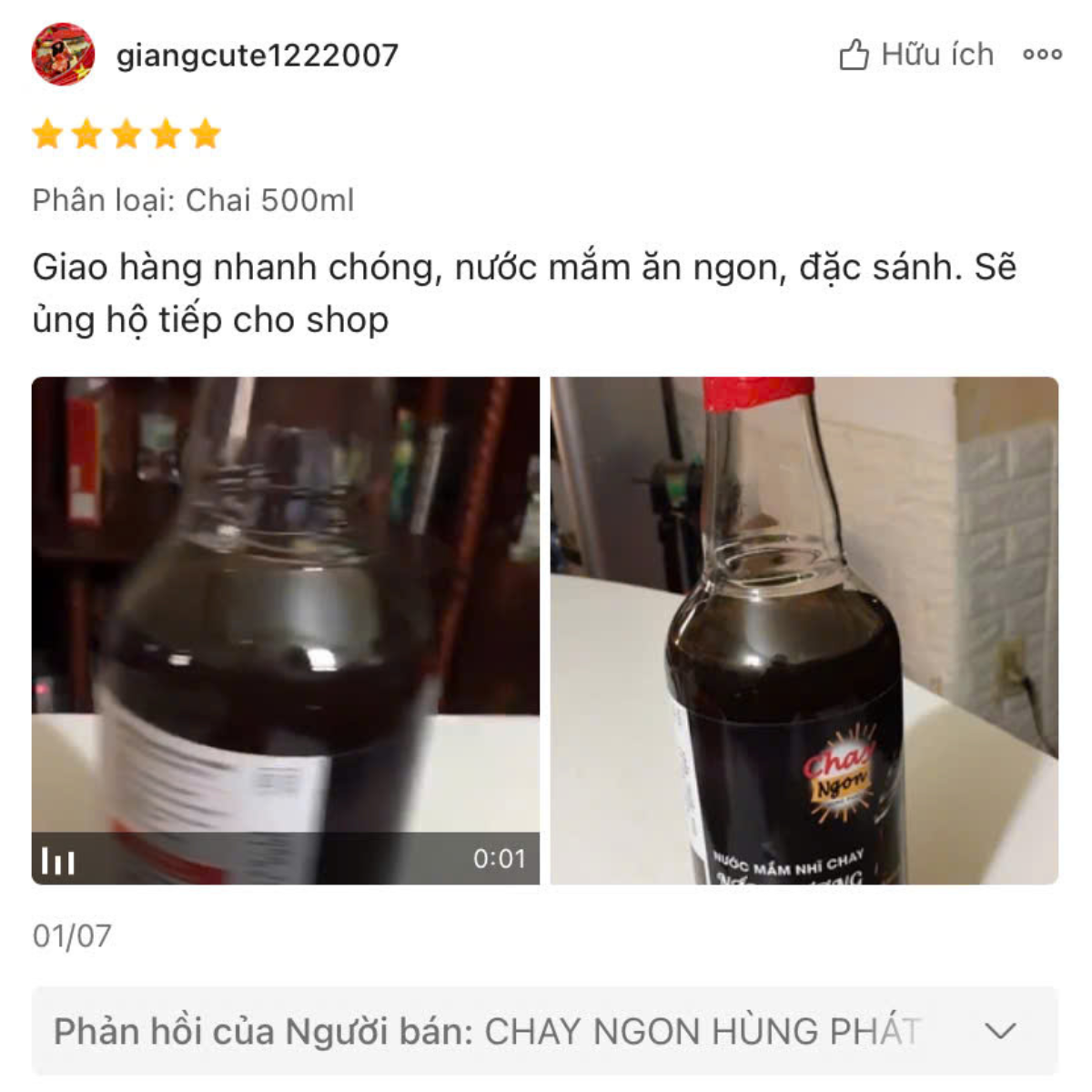 - Chị Giang: "Giao hàng nhanh chóng, nước mắm ăn ngon, đặc sánh. Sẽ ủng hộ tiếp cho shop.