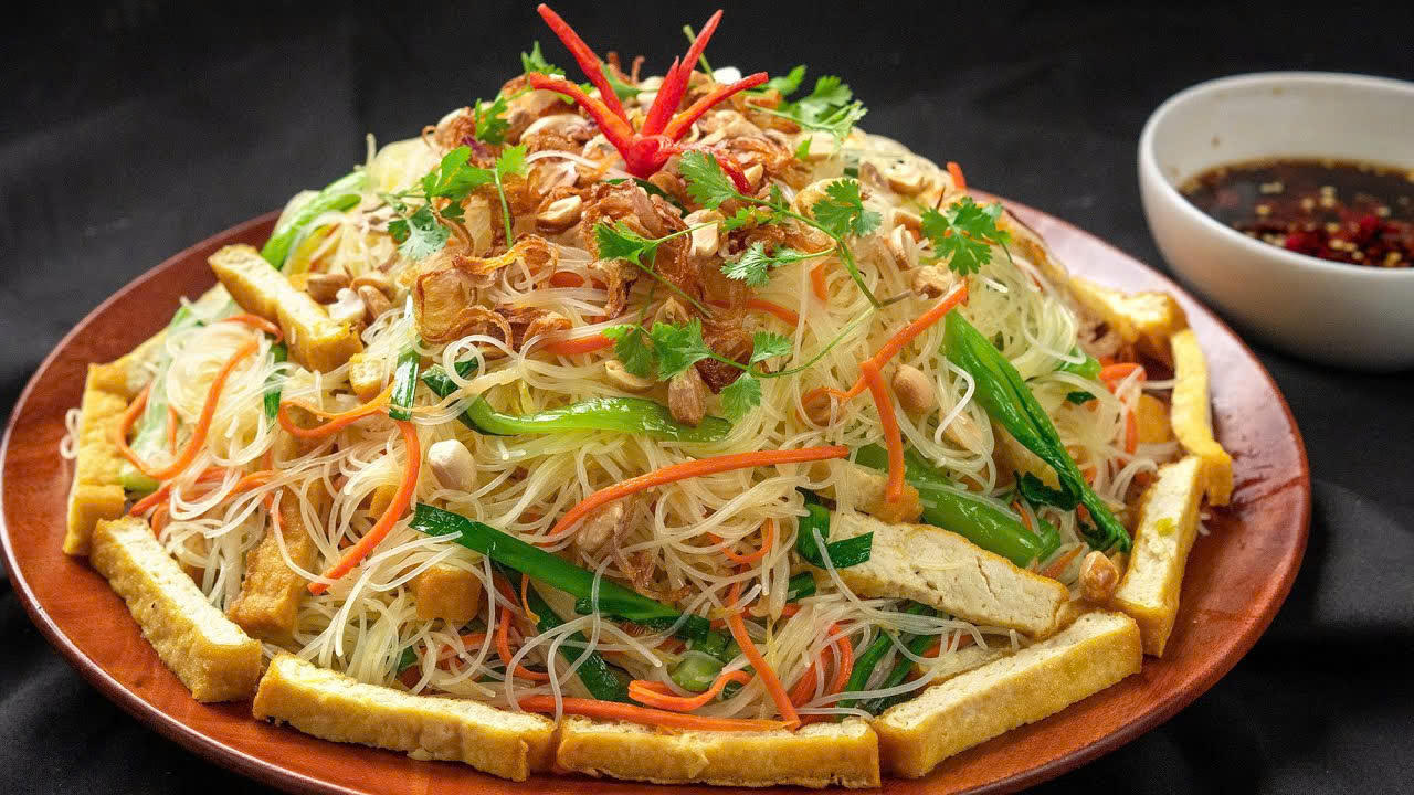 Món xào là phần không thể thiếu trong mâm cỗ chay/ mâm cúng chay ngày Tết. Bún xào rau củ thể hiện sự đủ đầy, đa dạng và màu sắc rực rỡ từ đủ loại rau củ, mang lại năng lượn tươi mới cho năm mới.