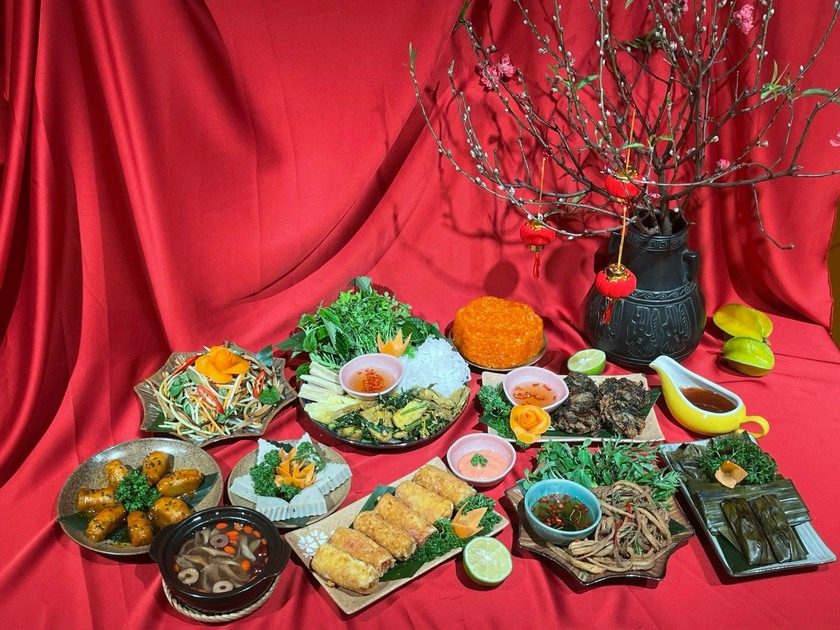 Xôi gấc đỏ, bánh chưng chay, nem rán chay, canh bóng chay, cơm chiên lá sen, rau củ xào, canh khổ qua chay. Đây là những món ăn biểu trưng cho sự may mắn, ấm no và hạnh phúc trong năm mới.