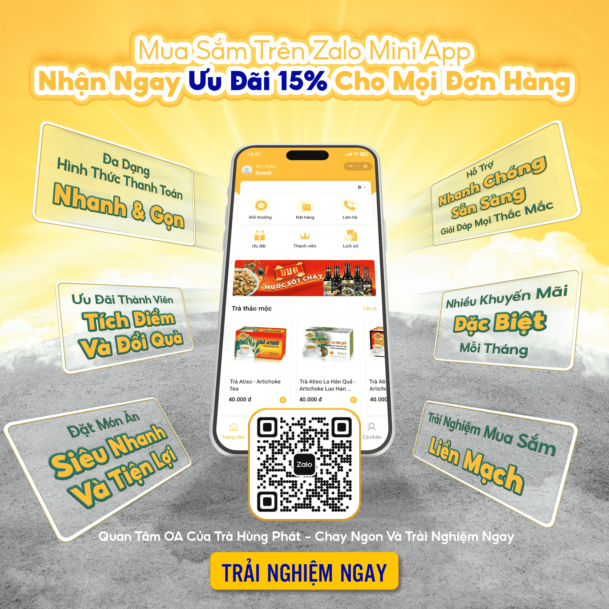 Mua sắm trên Zalo Mini App Trà Hùng Phát - Chay Ngon để nhận ngay ưu đãi 15% cho mọi đơn hàng